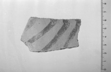 Kézzel készült, vastagfalú, íves edényből származó oldaltöredék, külső felületén sárgásvörös színű bevonaton vörös festésű párhuzamos cikk-cakk vonalakból álló motívum részletével. |