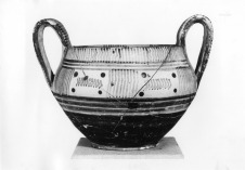 Bikónikus testű kétfülű kantharos. A perem és a test legszélesebb pontja között elhelyezkedő függőleges szalagfülek ívesen a szájperem fölé emelkednek. Az edény alsó felét fekete színű bevonat , fölötte a fülindítás alatt három széles párhuzamos vonalból álló sávozás. Az edénytest felső részén két motívum váltakozásából adódó metopés elrendezésű díszítés látható: függőleges halszálka sor és sarkaiban egy-egy pont, valamint sűrűn elhelyezett függőleges párhuzamos vonalakból álló díszítőmező váltakozik egymással. A díszítősáv fölött három párhuzamos vízszintes vonalból álló sávozás fut körbe, fölöttük pedig, a perem alatti sávban függőleges párhuzamos egyenes vonalakból és hullámvonaéakból álló díszítőmezők váltakoznak egymással. A fülek külső felületét vízszintes vonalak díszítik. Az edény belsejét homogén fekete bevonat fedi. |