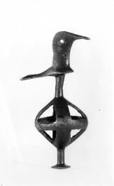Az áttört gömbön ülő lapított testű madáralak testének alsó és felső részét éles gerinvc választja el egymástól. Nyaka széles, lapos, szemét kerek furat jelzi. A geometrikus madárplasztikára általánosan jellemző lapos forma a darab közelebbi lokalizációját nem teszi lehetővé. A lelőhelyes darabok adta kronológiai támpontok alapján a madárszobrocska a Kr.e. 8.század végénél nem készülhetett korábban. Az áttört gömbre helyezettt madár alak típusa keleti, anatóliai eredetű, amely Görögországban meghonosodva önálló típusok kialakulásához vezetett. A geometrikus formakincsbe jól beillszkedő új motívum egy keleti hatásra kialakult jelvényfomra lehetett, amely széleskörű elterjedése alapján területileg pontosabban nem definiálható.