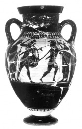 Az egyik gyalogosok párviadalát ábrázolja, mellettük köpenyes, botot tartó néző. Mindkét harcos hosszú hajú - ilyennek ábrázolta Homéros a trójai háború hőseit. Mindketten forgós sisakot, testükhöz simuló mell- és lábvértet viselnek, kezükben dárdát és pajzsot tartanak, oldalukon kard. A jelenet olyan párviadalt ábrázol, amelyben egy idősebb (a szakállas alak) hérós megfutamítja fiatalabb ellenfelét, megnevezésükre azonban nem kínálkozik biztos támpont.