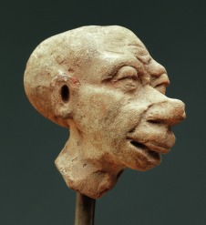 Hosszúkás, feltűnően nagy fejjel rendelkező (makrokephal) kopasz férfi rendkívül sovány, előrenyúló arccal. A homlokon ráncok, a szemhéjak is külön kimintázva. Erős szemöldökív és igen nagy orr jellemzi. A száj félig nyitott, a felső fogsor kilátszik, az áll beesett. A jobbra hajló nyak sovány, az ádámcsutka is látható. Nem formából készült, szabadon mintázva. |