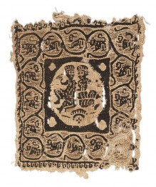Fehérítetlen len láncfonalon lila és fehérítetlen gyapjú vetülék, a részleteket festetlen lenből gyorsvetélővel dolgozták ki. Nyúl- és oroszlánalakokat tartalmazó indadíszítés keretezi a középső kerekdíszt, amelyben két ember látható. A külső keret "futókutya"-motívum. A kerekdísz baloldali alakja (férfi?) jobb kezét felemeli, bal karjával pedig átöleli a (női?) alakot a jobbján, aki jobb karjával öleli őt át, bal karját pedig kinyújtva tartja, szónoki pózban. Az ábrázolás előterében egy pajzs és egy lándzsa (?) látható. A kerekdíszben ábrázolt két beszélgető alak típusa eredetileg egy összetettebb jelenet részét képezte, ahol négy (esetenként még több) alak volt látható a textilen, valószínűleg ezek szolgáltak mintául a jelen szövethez. A negyedik-ötödik században a sziluett-stílusú figurális textilek szorosan követték a későantik magas művészet klasszikus témáit és stílusát. A szövött képeket tervező és kivitelező mesterek mintáikat elsősorban irodalmi és mitológiai művek illusztrációjából merítették: a forrás ennek az olcsóbb kivitelű tunikadísznek az esetében egy pásztorköltemény lehetett. Elképzelhető, hogy szászánida modellre vezethető vissza, amely talán bizánci selymek közvetítésével került Egyiptomba. |