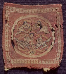 Festetlen gyapjú láncfonalon festetlen, vörös, zöld, fekete és sárga gyapjúvetülékkel szőtt ruhadísz. A központi kerekdíszen egy halványan látható vázából indák nyúlnak ki, amelyek két, címerszerűen elhelyezkedő, egymással szemben álló foltos vadállatot, a felső regiszterben pedig két Erós alakot vesznek körül. A központi kerekdísz keresztfrízzel keretezett négyzetes mezőben helyezkedik el. Az erre a darabra is jellemző stílust leginkább az 5. századi szövetek bukolikus jelenetei képviselik. Az ilyen textilek ikonográfiai programjának kifinomultsága és a fekete kontúros, finoman kidolgozott alakok alapján gyanítható, hogy mintájukul - talán alexandriai - kézirat-illusztrációk szolgáltak. A jelen darab viszont valószínűleg későbbi és más forrásból származik: a 6-7. századi selymek ikonográfiai repertoárját veszi alapul, amelyre a szászánida textilek hatottak. |
