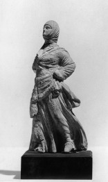 A jobb lábával kilépő, lobogó ruhájú siető nő chitónt, valamint a karjait és az arc kivételével a fejét szorosan beborító köpenyt visel. Jobb keze a köpeny alatt a mellén, a bal a csípőjén nyugszik. Fejét kissé felemeli, lábán cipőt visel. Hátul is kidolgozott, teljes körplasztika. Két formából készült. A test üreges, alul zárt (talapzat nélkül), hátul kis kivágott szellőzőnyílással. |
