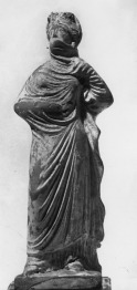 A vékony, négyszögletes talapzaton bal lábára nehezedő, jobb lábát kissé előre helyező nőalak áll. Hosszú chitónt és földig érő köpenyt visel, amely mindkét karját eltakarja, és amelynek felső szélét bal kezével álla elé húzza. Fejét kissé jobbra és fölfelé fordítja. Negatív mintából készült, a hátoldal is kidolgozott. A test üreges, alul nyitott. |
