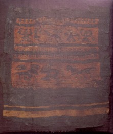 Egy tunika eleje alsó felének darabja. Alul sárga szegélycsíkok láthatók, fölöttük pedig két díszített, fekete gyapjú anyagba szőtt sáv következik, amelyben táncoló alakok (fent) és négylábúak (lent) láthatók.