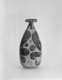 Az alabastron testét két szembenéző, kis talapzaton álló szirén-alak díszíti. A szájon, a vállon és alul nyelv-motívumok láthatók.