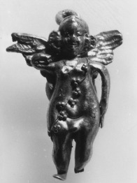 Az Erós-figura jobb lábával kissé előrelép, jobb kezét vállához emeli, balját a csípője mellett tartja: valószínűleg táncol. A hellénisztikus korban gyakran előfordul, hogy fülbevalók korongjára csüngőként szárnyas, repülő vagy táncoló Erós-figurákat függesztenek (ld. a kiállított fülbevalópárt, Hu-SzM-Ant-55.59.1-2 és Hu-SzM-Ant-55.204.1-2). Ez a darab azonban mérete és tömege miatt nem lehetett fülbevaló tartozéka, valószínűbb, hogy nyakláncra fűzték.