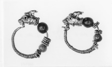Az állatfejes karikafülbevalók sorába tartozik ez az antilop- vagy gazellafejjel díszített fülbevalópár. A kiállításon bemutatott többi hasonló fülbevaló közül főként színességével tűnik ki: a sárga aranyékszert zöld kővel, valószínűleg malachittal tették mutatósabbá. Az egész fülbevaló vázát egyetlen, viszonylag vastag drót alkotja. Erre fűzték fel az alkotóelemeket: a két sima és két orsódrótból sodort elvékonyodó karika-részt; az öntött, üreges állatfejet, amelyre a szarvakat és a külön, lemezből elkészített füleket is utólag forrasztották rá; a kettő közé pedig egymással váltakozva granulátumgyűrűket és kőgyöngyöket. Az állatfejet hozzáforrasztották az alapdróthoz így az rögzítve van. A fejet és a karikát összekötő soktagú elemből viszont csupán az első és az utolsó granulátumgyűrűt forrasztották a mellette lévő karikához illetve a fejhez, a többi szabadon mozog. Az aranyműves az apró részletekre is ügyelt: a fejen a szőrzetet, az orr, a száj és a szem részleteit cizellált vonalakkal, élethűen mintázta meg; a szemeket eredetileg kővel díszíthette (ma már ez hiányzik); a fej mögé közvetlenül egy drótívekkel díszített hengert forrasztott, hogy a fej és a fülbevaló további elemei közötti átmenet fokozatos legyen; a kőgyöngyök méreteit is - a fülbevaló elvékonyodó formájának megfelelően - a fejtől a karika felé csökkentette. A karika végének rögzítésére az állat szája alá tartókarikát forrasztott. Kőgyöngyökkel és öntött állatfejjel díszített karikafülbevalók Ciprusról, a Pontus-vidékről és Thrákiából ismertek. Antilop/gazellafejjel díszített egyelőre csupán ez a példány ismert. A hasonló darabok alapján a hellénisztikus kor késői időszakában, a Kr.e. 2. században készülhetett. Több technikai részletben is egyezik a kiállításon látható hiúzfejes fülbevalóval (ltsz.: Hu-SzM-Ant-55.200), ezek a következők: 1. ugyanarra a drótra fűzték fel a gazellafejet, a drótokból sodort karika-részt, valamint a fejet és a karikát összekötő többtagú elemet, mint a hiúzfejes darabon. 2. a vázként szolgáló drótot ugyanúgy rögzítették a gazellafejhez, mint a hiúzfejhez, vagyis kivezették az állat száján és hozzáforrasztották. 3. az állatfejeket is azonos módon készítették: öntötték, a füleket és szőrcsomókat pedig külön, lemezből készítették el és utólag forrasztották a fejre. A gazella esetében a szarvak előtti, a hiúz esetében a pofán lévő szőrcsomó készült így. 4. a fejet és a karikát összekötő elem a gazella- és a hiúzfejes fülbevalón is azonos felépítésű: gyöngyökből és granulátumgyűrűkből áll 5. a granulátumgyűrűket mindkét esetben ugyanúgy készítették: lemezszalagból hajlítottak karikát és arra forrasztották sorban a granulátumokat 6. a karika-rész összesodort drótjait egyik fülbevalón sem dolgozták össze az elvékonyodó végükön a fülbevaló vázaként szolgáló dróttal. Mindezek alapján feltételezhető, hogy azantilop/gazellafejes fülbevalópár és a hiúzfejes fülbevaló ugyanabban az aranyműves műhelyben készülhetett. (Vö. a kettőt.) |