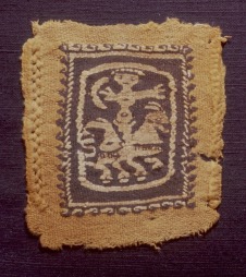 A láncfonal sárga gyapjú, a vetülékfonal sárga és barna gyapjú, valamint fehérített len. Sárga gyapjú anyagba beleszőtt mintán lovas katona látható, aki jobb kezében pajzsot tart. A ló feje meglepő módon egy kecskéére hasonlít. A lószerszámot olyan függődíszekkel dekorálták, amelyek a kopt lovas harcosok metszeteken, falfestményeken és textileken megjelenő ábrázolásának hagyományait követik. A tunikadísz kettős vonalkeretét "futó kutya" minta veszi körül. |