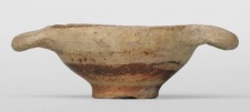 Miniatűr edény, talpa törés nélkül folytatódik a lapos, hirtelen kiszélesedő testben. Vízszintes, kissé lehajló fülű, igen vékony edényfallal. Belsejét vörös-fekete máz, alját vörös sáv, a külsejét pedig vízszintes sávok fedték. |