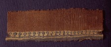 Stilizált árkád-fríz díszítésű textilcsík; a dekorációt a sötét barna alaptextilbe szőtték.