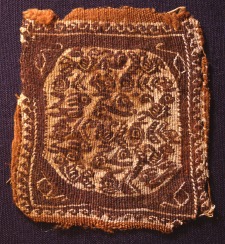 A tunikadísz láncfonala sárga gyapjú, a vetülékfonal sárga és sötét barna gyapjú; a belső részleteket és a szumák-szegélyt gyorsvetélővel és sárgás lenszálakkal mintázták. A négyszögeletes mező közepén kissé deformált, szinte nyolcszög-formájú kerekdísz látható, amelyben összezsúfolva madarakat, halakat, nyulakat és oroszlánokat ábrázoltak. A tabulát "futókutya"-fríz keretezi, sarkaiban hosszúnyakú madarak jelennek meg. A késő-fátimida kori datálást a pöttyös madárfarok indokolja (vö. az Antik Gyűjtemény 75.35.A leltári számú darabjával). A darab a természet formáinak egyszerű formákká való alakítását illusztrálja: a hagyományos nílusi táj ezen a textilen már a kiragadott, jellegzetes elemek repetitív listájává vált, a természeti formák ornamenssé stilizálódtak. |