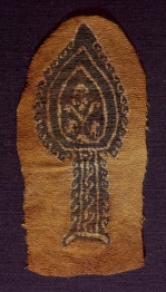 Sárga gyapjú alaptextilbe szőtt levélalakú dísz (sigillum), amelyet "futókutya"-fríz keretez. A levél dupla szegélyén belül palmetta díszítés látható. A motívumok azon 6-7.századi dekorációkból származnak, amelyek a szászánida selymek, ill. azok egyiptomi másolatainak hatása alatt fejlődtek ki, a gyapjú láncfonal és a sigillum alakja viszont inkább a Fátimida-kor ízlését tükrözi.