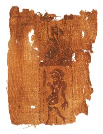Fehérítetlen lenszövet-alapba szőtt barna minta, gyapjúszálból, clavusban mezítelen harcos és futó nyúl.