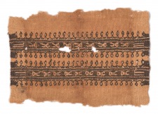 Tunika-részlet kettős szalagdísszel: mindkét szélén girlanddal keretezett barna sávban stilizált ember - vagy állatalakok. A szalagok végén párhuzamos vonalak. Sárga, fehér és vörösesbarna színű. A természet formáinak egyszerű formákká való alakulásának folyamatát illusztrálja ez a darab. A hagyományos nílusi táj,amely a későantik és korabizánci kor világi és vallási reprezentációjának fontos témája volt, kiragadott jellegzetes elemek repetitív listájává vált. Azt a folyamatot a kopt művészetben, amelyben a természeti formákat ornamenssé stilizálták, az egyszerű formák hagyománya készítette elő és az iszlám művészet bátorította.