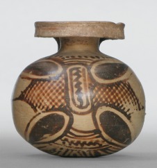 Talp nélküli, kissé lapított test, alacsony nyak, széles, oldalt konkáv szájperemmel, amelynek szélét a vállal rövid szalagfül köti össze. Testét az asszír lótusz-csillag motívumból leegyszerűsödött növénydísz borítja, sötétbarna festéssel. Hátul a testen három vonalból rajzolt csillag, a nyakon függőleges, a lótuszmotívum felett pedig vízszintes vonaldísz látható. |