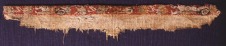 Tunikarészlet szegélydísszel, amelyen két úszó puttó, három levélpár és egy állat. Vörös, fekete, sárga, fehér és sárgászöld színnel készült. |