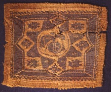 Sárga és barna színnel készült, négyszögletes tunikadísz, amelyen nyolcágú csillagban elhelyezett nyolccsúcsú rozetta, a középső kerekdíszben pedig talán madár látható. |