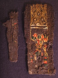 Tunika szalagfonat dísz végével, alatta pedig szembenézetből ábrázolt emberalakkal, aki két kezében virágfüzért tart. Elképzelhető, hogy a darab egy ruhát alkotott a Gyájtemény egy másik töredékével. A dísz barna alapon sárga, vörös és zöld színnel készült.