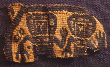 Tunikadísz része, amelyben két frontálisan ábrázolt, táncoló (?) emberalak látható aediculában. Sárga alapon fekete színnel készült.