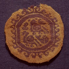 A kerekdísz futókutya-mintás keretében két balra forduló madár látható, a felső visszanéző fejjel, körülöttük három állat (?). Sárga és barnáslila színnel készült. |