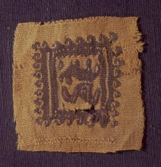 A tunika-részlet futókutya-mintával keretezett négyszögletes díszében két jobbra néző négylábú állatalak látható. Sárga, lila és barna színnel készült. |