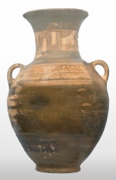 A vállon elhelyezkedő két függőleges fül alapján az edény a váll amphorák típusába sorolható. Az alacsony talpgyűrűn álló tojásdad formájú amphora felületét sötét bevonat fedi, a két fül közötti és a nyakon körbefutó egy- egy vastagabb sáv kivételével. A két sáv belsejét ornamentális díszítés tölti ki: a váll zónájában cikk-cakk és farkasfog minta, a nyakon pedig öt vonalból álló bástyaminta fut körbe. A fülek külső felülete vízszintes vonalkázással díszített. Díszítése alapján az edény a kora-geometrikus időszak érett szakaszára tehető. |