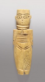 Sárgás színű csontból készült nőidol. Bekarcolt vonalakkal jelölték a szemöldököt, a szemeket, a nyakvonalat, az ágyékot és a lábakat. Csak az orrot és a mellet formálták meg plasztikusan. Az ilyen típusú nőalakok a terrakotta áldozati- és amulett-szobrocskák utódai, amelyeket a házassággal, termékenységgel, gyerekszüléssel kapcsolatban hívtak segítségül.