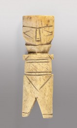 Szögletes kiképzésű, sárgás színű csontból készült nőalak. A szemöldököt, a szemet, a szájat, a hasredőket, az ágyékot és a lábfejet bekarcolt vonalakkal jelezték, az orr plasztikus. A vállakba lyukakat fúrtak, amelyek a mára elveszett karok beillesztésére szolgáltak. A szobrocskát csak az előoldalán faragták ki. Az ilyen típusú faragványok a terrakotta áldozati- és amulett-szobrocskák utódai, amelyeket a házassággal, termékenységgel és gyerekszüléssel kapcsolatban hívtak segítségül.