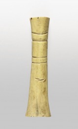Sárga színű csontból készült elnagyoltan megformált idol. Bekarcolt vonalakkal jelezték az állat, a nyakat, a derékövet és az ágyékot. Ezek a faragványok a terrakotta áldozati- és amulett-szobrocskák utódai, amelyeket a házassággal, termékenységgel, gyerekszüléssel kapcsolatosan hívtak segítségül.