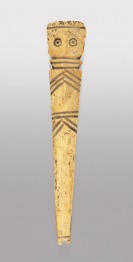 Kés- vagy tűalakú lapos faragott csont figura. A hajviseletet, a Venus-gyűrűt, a melleket (?) és a hasredőket véséssel jelezték. A szemeket pontozott körök jelölik. A testforma teljes absztrakciója figyelhető meg. Ezek a faragványok a terrakotta áldozati- és amulett-szobrocskák utódai, amelyeket a házassággal, termékenységgel, gyerekszüléssel kapcsolatosan hívtak segítségül.