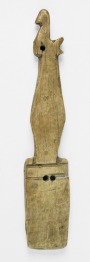 Lapátvégű csattogtató, amelynek nyele madárfejben végződik. A lapátrészen két lyukat fúrtak, amelyeken zsinórokat vezettek át, és velük rögzítették a hozzátartozó, mára elveszett csontlapokat.