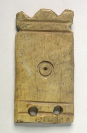 Egy másik, azonos méretű lappal együtt eredetileg csattogtató részét képező csontlap. Végén vésett dísz. Szélein két-két bekarcolt vonal, középen pontozott kör.