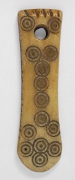 Ismeretlen rendeletetésű csat-alakú csontlap fehér színű csontból. Elöl faformába rendezett pontozott körökkel díszített, hátul sima.