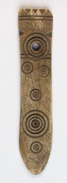 Ismeretlen rendeltetésű, csat-alakú, alul lekerekített, faragott csontlap. Elöl pontozott körökkel és bekarcolt vonalakkal díszítették, hátul sima. A felül rovátkolt tárgyra kerek lyukat fúrtak. Szoros rokonságot mutat az Antik Gyűjtemény 74.37.A számú darabjával.