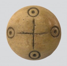 Felül bekarcolással díszített, felső oldalán domború, alsó oldalán lapos (társasjátékhoz tartozó?) csontgomb.