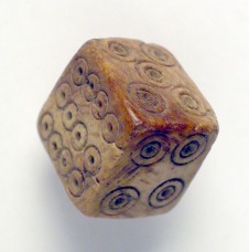 Csont dobókocka, öt oldalán kettős körökkel jelzett számokkal (két-kétszer 4 és 5, egyszer 6), a hatodikon tizenkét kör, közepükön ponttal.