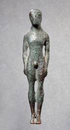 A ruhátlan ifjút ábrázoló szobortípus (kuros) kisplasztikai képviselője. A frontális nézetű, ruhátlan alak lábai zártak, mindkét kinyújtott keze a comb mellett. Az izomzatot és az arcvonásokat elnagyoltan mintázta meg a mester. A haj rövid. Az egyszerű, attribútum nélküli szobrocska alighanem fogadalmi ajándék lehetett. |