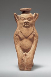 A formából készült edény térdeplő Silénos alakját mintázza. Silénos testéhez viszonyítva aránytalanul nagy fejének fej két oldalán nagy, elálló lófülek meredenek felfelé. Az arc széles, lapos, a szemek mandulavágásúak. A széles, lapos orr és a vastag, húsos száj az állatias vonásokat hangsúlyozza. A vízszintes árkolásokkal hullámosnak jelzett haj elöl két-két fonatban a mellig, hátul a hát közepéig ér. A ruhátlan alak testformáit elnagyoltan mintázták meg. Eredetileg az edény vörösre volt festve, erről ma már csak egy-egy foltban megmaradt festéknyom tanúskodik. A festés alatti fehér alapozó réteg több helyen is jól látható. Az archaikus korban az illatszerek, illatos olajak tárolására használt kisméretű, szűk kiöntőjű edények egyik kedvelt típusát a különféle ember- és állatalakú plasztikus edények alkották. |