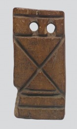 Lapos, téglalap alakú falapocska, amelynek külső felületét bekarcolt, vízszintes és átlós vonalakkal díszítették. A két nagy lyuk a csattogtató másik felével való összekapcsolásra szolgált. A bekarcolt vonalak azokkal a terrakotta nőalakokkal rokonítja a darabot, amelyek közül az Antik Gyűjtemény is több darabot őriz, de talán még szorosabb kapcsolatot mutat a csontfaragványokkal, amelyek a 8. század táján váltották fel a terrakotta figurákat. Az ilyen típusú szobrocskákat feltehetően a házassággal, termékenységgel és gyerekszüléssel kapcsolatban hívták segítségül.