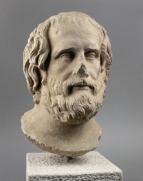 Euripidés fő portrétípusának, az ún. Farnese-változatnak egyik jó példánya. Eredetijét Lykurgos állíttatta föl Kr.e. 330 körül az athéni Dionysos-színházban. A kompozíció a tragikus triászt ábrázolta: Aischylos és Sophoklés állt, Euripidés ült. A mű egy feltevés szerint a késő-klasszikus kor legnagyobb szobrászának, Lysipposnak az alkotása lehetett.