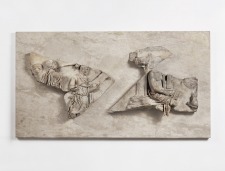 Az egyik lapon a sziklán ülő Apolló látható köpenyben, ruhátlan felsőtesttel, mögötte tripus. Baljával kitharáját a combjára támasztja, jobbja a pléktronnal nyugodtan az ölében pihen. Fejének csak körvonalai maradtak meg. Az isten tekintete a tenger és a hajók felé irányul, amelyeknek néhány részlete a dombormű jobb sarkában maradt meg. Két egymás alatt kifaragott hajó hátsó része (a tat), köröttük a tengert jelző hullámvonalak. A felső, tengeri csillaggal díszített hajófar mellett kormánylapát csüng le. A másik domborművön jobbra haladó menet három férfiből álló töredéke. Mindhármukon római viselet. Az elülső, akinek vonásaiban olykor Augustus császár vonásait vélték fölismerni, előrenyújtott bal kezében fáklyát tartott. A mögötte lépdelő kísérő emelt fejjel trombitát (lat. tuba) fúj. A harmadik, visszaforduló alaknak csak a feje maradt meg. A két márvány töredékei hatalmas építmény díszítő dombormű-sorozatának darabjai. Hozzájuk 2000-es évek elején újabb darab (a 3. relief) járult, megszerzése a magyar múzeumok történetének egyik legnagyobb mértékű gyarapodását jelentette. A relief-ciklus az augustusi aranykor emlékét, a birodalom sorsát eldöntő actiumi csatát és a hozzá kapcsolódó eseményeket idézi fel. |