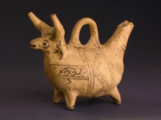 Hordótestű, bikafejű, széles, elkeskenyedő farokkal és négy kis, hengeres lábbal ellátott egyfülű, bikafej-kiöntős edény, ún. askos. A test közepén függőleges vonalakkal határolt, négy vonalból álló festett cikkcakk-motívum fut körbe. Az állat mellső részén két-két vízszintes vonallal keretbe foglalt, közepükön ponttal díszített kettős körökből álló, a kiöntő alatt kettéosztott minta. A bika szemét, fülét és száját festéssel hangsúlyozták. A szarvakon és a fejtetőn párhuzamos, festett vonalak láthatók. A széles, rézsútos farkon párhuzamos vízszintes vonalazás fut végig. A talpak is festettek, az edény hasán vastag kereszt-minta. Az edény Ciprus középső bronzkorának az ún. 'fehérrel festett áru' sorozatába tartozik.
