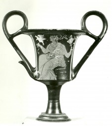 Vörösalakos kantharos; széles, három lépcsős talpon magas láb, középen reliefgyűrű. Csaknem egyenes falú edénytest kihajló szájperemmel. Az edény aljától kiindulú, perem fölé nyúló szalagfül, amely a peremhez kis rúddal csatlakozik. A fülek alján kihajló végű kis lap. A képmezőn kívüli felületet fekete, fémesen csillogó máz fedi, kivéve a talp alját, két sávot a talp lépcsőin valamint a fülek mögötti részt. A váza egyik oldalán szárnyas női büszt hajhálóval (sakkos). A teljes női büszt fehér járulékos színnel fedve. Másik oldalán sziklán ülő, gazdagon ékszerezett, hosszú ruhás nőalak, hajában sphendoné sugaras diadémával, szalaggal. Bal kezében tükröt, jobbjában zsinóron madarat tart. Fehér járulékos színnel a sphendoné szalagjai és a madár. Sárgával az ékszerek, a tükör részletei és a sávok a madáron. A szárnyas női büszt nyilván istennőt ábrázol. Érdekessége azonban inkább technikai részleteiben rejlik. A lekopott fehér fedőfestés alatt ugyanis jól látszik, hogy a festő eredetileg a szokásos profilnézetben akarta az arcot ábrázolni és csak később változtatta meg háromnegyedes nézetre. A bal szem továbbra is profil-nézetű. A késő-apuliai (Kr.e. 4. sz. utolsó negyede), többnyire már kisebb igényű vázákat nehezebb mesterkezekhez kötni. (attribúció)] A gyűjteményben azonban van egy másik kantharos, amelyről a részletek hasonlósága alapján feltételezhető, hogy ugyanahhoz a kézhez köthető, mint ez a váza. |