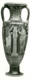 Harang alakú talpon karcsú, tojásdad testű amphora; kihajló szájperem, bordázott fülek. A vörösalakos képmező alatt futó kutya-minta, a vállon babérág. A nyakon mindkét oldalon álló palmetta, mellette egy-egy inda. A fülek alatt spirális palmetta-fa. A váza egyik oldalán középen sírtábla (sztélé) oldalnézetben, rajta ráakasztott ajándékok. Balra ruhás, köpenyes nőalak bal kezében tállal, jobbjával áldozatot tesz a sírtábla tetejére. Jobbra ruhátlan ifjú felemelt jobb kézzel. Másik oldalán két szembenéző, köpenyes ifjú. Fölöttük ablak, két oldalt egy-egy karika. Ruharészletek, ajándékok sárga illetve fehér járulékos színnel festve. A cumae-i műhelyre jellemző sírjeleneten a ruhátlan, héroizált ifjú a halottat jeleníti meg hasonló pózban ábrázolva, mint a gyűjtemény egy másik campaniai amphoráján, szintén sírjeleneten. A váza a Kr.e. 4. sz. közepétől működő cumae-i műhely terméke. |