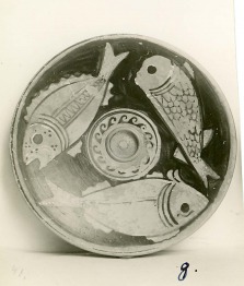 Alacsony lábon széles, alig mélyülő tányér lehajló, függőleges peremmel. Közepén kis, peremes bemélyedés, e körül futó kutya-minta, ugyanígy a peremen is. A tálon három balra forduló hal. Halas tálakat szinte valamennyi dél-itáliai műhely készített. A mindennapi étkezésből ismert halakkal díszített, hasonló formájú tálak Athénból is ismertek, a dél-itáliai műhelyek innen vehették az ötletet. |