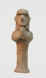 Kézidobot maga elé tartó, meghatározatlan nemű alakot ábrázoló, ún. "hóember"-technikával, azaz kézzel formált agyagdarabok egymáshoz tapasztása révén készült figura. A lefelé kiszélesedő ovális talapzat alatt hengeres lyuk látható, amely vagy az égetés során a levegő eltávozására szolgált, vagy pedig arra utal, hogy a figurát egy pálca segítségével mintázták meg. Alighanem eredetileg is festetlen. A kézidobot tartó alak gyakori a ciprusi terrakotta-plasztikában. A típus a Közel-Keletről származik. Hasonló darabok ásatásokon a Kr.e. 6. századra keltezett rétegekből kerültek elő. Fölmerült, hogy a szobrocska talán a sziget Idalion nevű (Dali) városának műhelyében készült. |