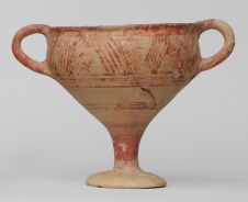 Kétfülű talpas serleg, ún. kylix. Kiszélesedő, széles talpban végződő gömbös test, enyhén kihajló perem, két függőleges, kerek átmetszetű fül. A fülzónában található díszítősávban függőleges halszálka mintából (ún. chevron-minta) és rézsútos vonalnyalábokból álló kompozíció található. A díszítés alatt különböző vastagságú vonalakból álló sávozás. A fülek teljesen festettek. |