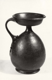 A sötétzöld patinájú, lefelé erősen kiöblösödő, nyakban összeszűkülő, széles tölcsérszerű szájú edény az úgynevezett lékythos-aryballos formát képviseli. A testet lezáró széles talpkorong felületét koncentrikus vésett körök díszítik. A nyak tövénél hármas vízszintes bordázat fut körbe és a peremet is körgyűrűk díszítik. Az edényfülön lefelé szűkülő kettős plasztikus bordadísz fut le. A fül kiszélesedő alsó részét áttört indadísz zárja le, amely két oldalt pelta motívum, alul fordított szív alakzatból hegyes levél nyúlik le. Az edény a késő-klasszikus - kora-hellénisztikus időszakra (Kr.e. 4. század vége - 3. század eleje) keltezhető, Görögországban és Makedóniában elterjedt edénytípus, amelynek képviselői egészen a mai Szlovákia területéig (Hurbanovo) is eljutottak; minden bizonnyal a delphoi hadjáratból visszatérő kelták hadizsákmányaként.